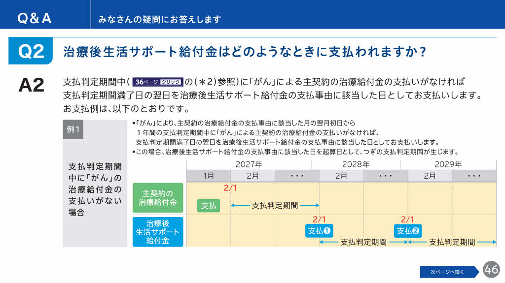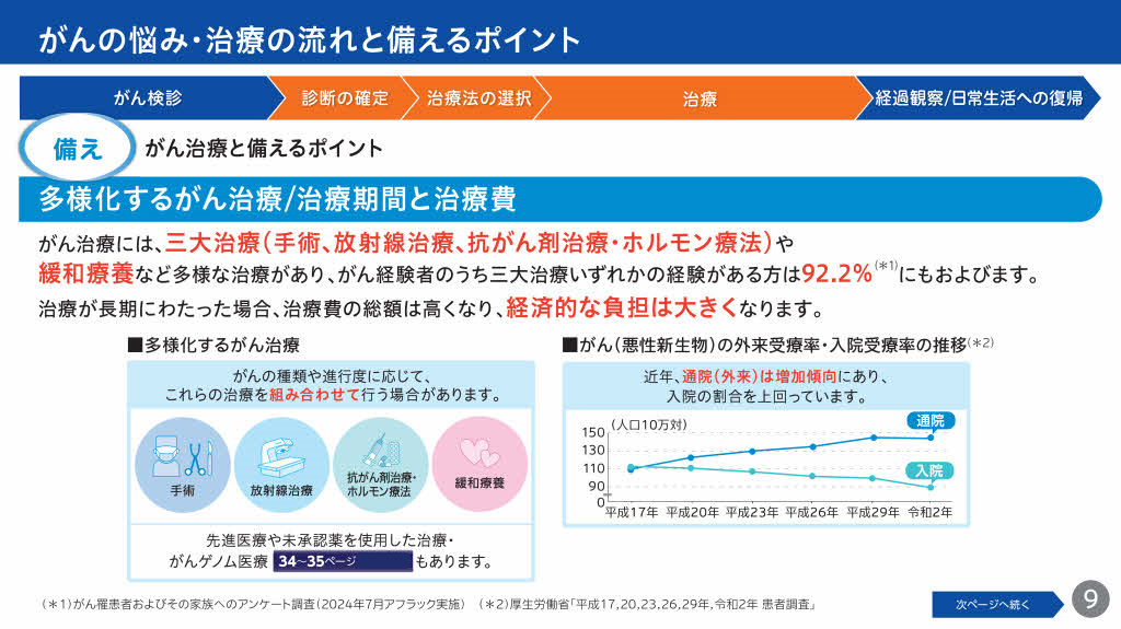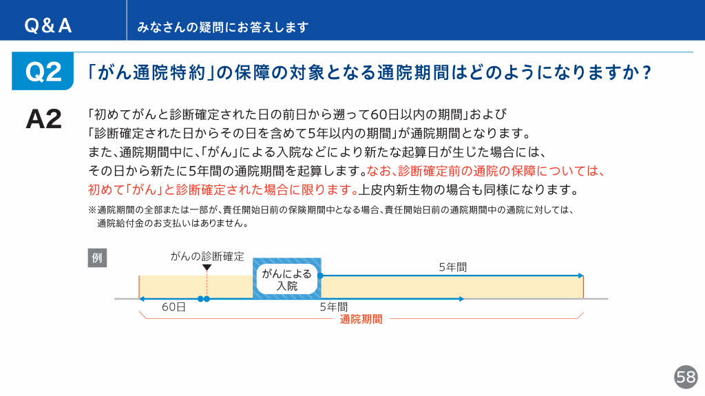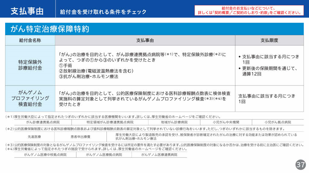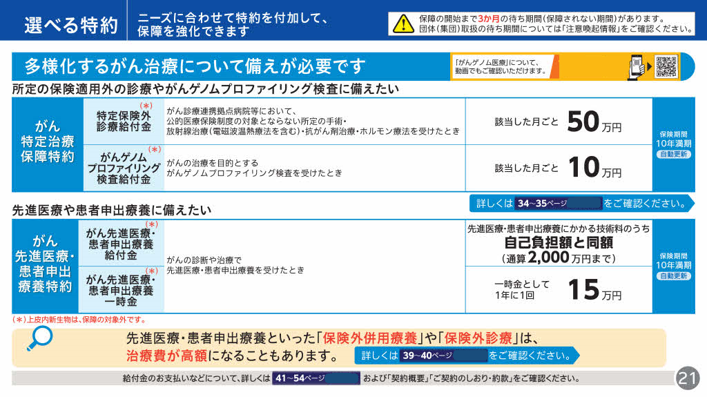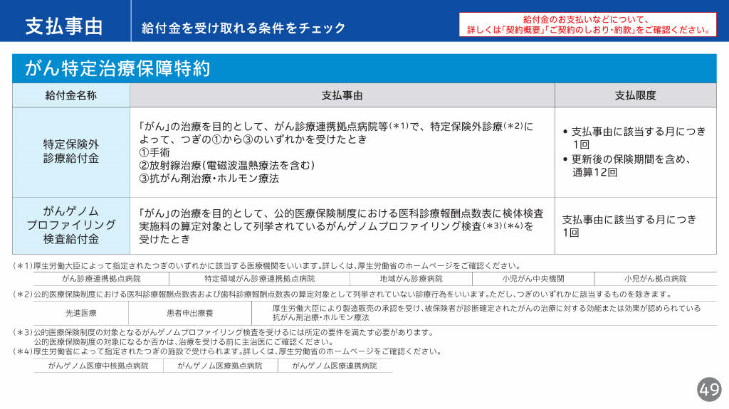 ※特定保険外診療(がん診療連携拠点病院等において、公的医療保険制度の対象とならない所定の手術・放射線治療・抗がん剤治療・ホルモン剤治療を受けたときにお支払いします)やがんゲノムプロファイリング検査を受けたとき、給付金をお受け取りいただけます。