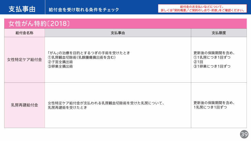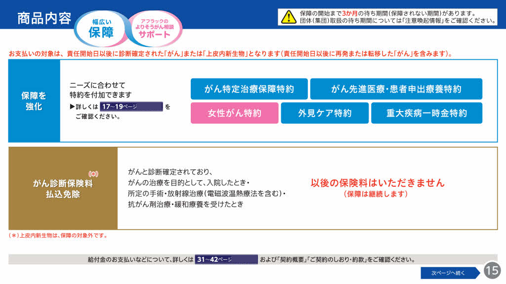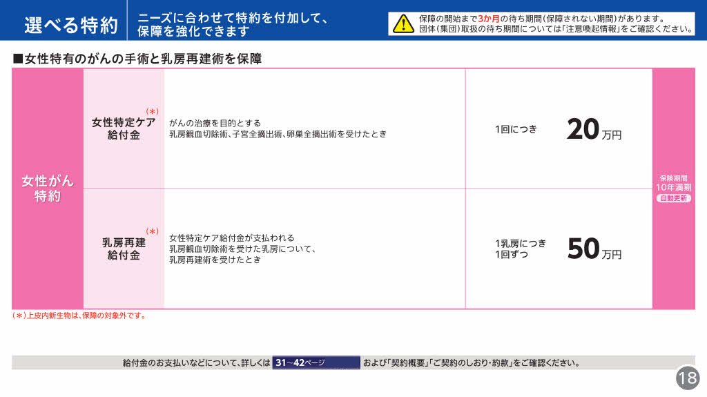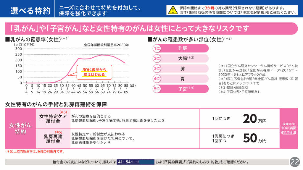 ※女性がん特約は以下のがん保険には付加できません。新がん保険/スーパーがん保険/生きるためのがん保険Days1 WINGS /生きるためのがん保険Days1 ALL-in/優しいがん保険。