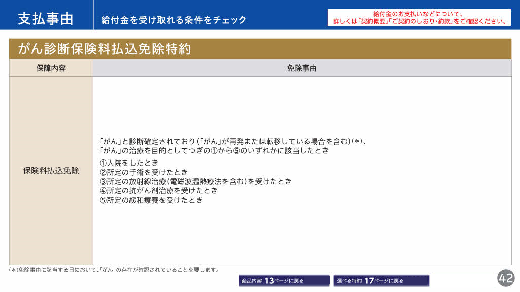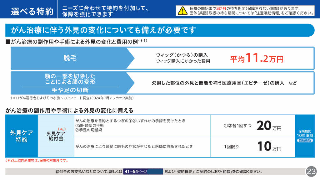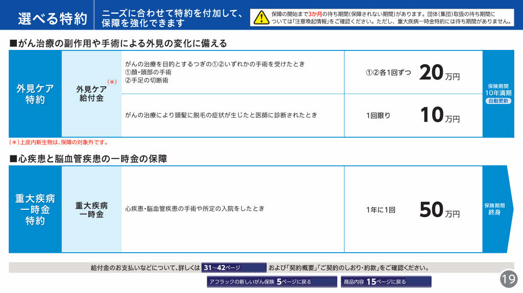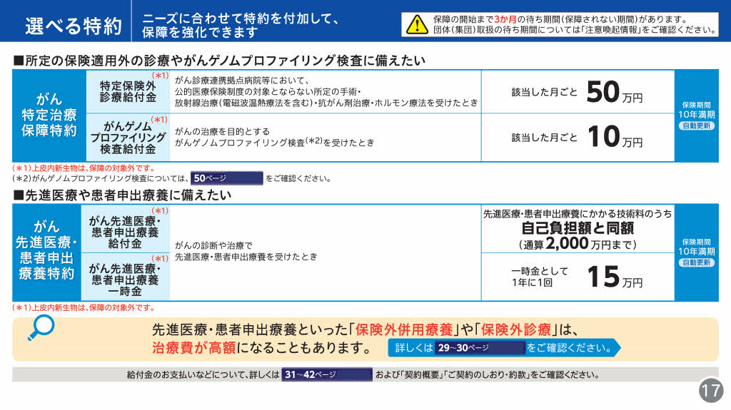 ◉ご契約中の「がん保険」の種類、保険料払込期間などによっては、特約を中途付加できない場合があります。また、各種特約にはご加入に限度があります。詳しくは「契約概要」などをご覧ください。