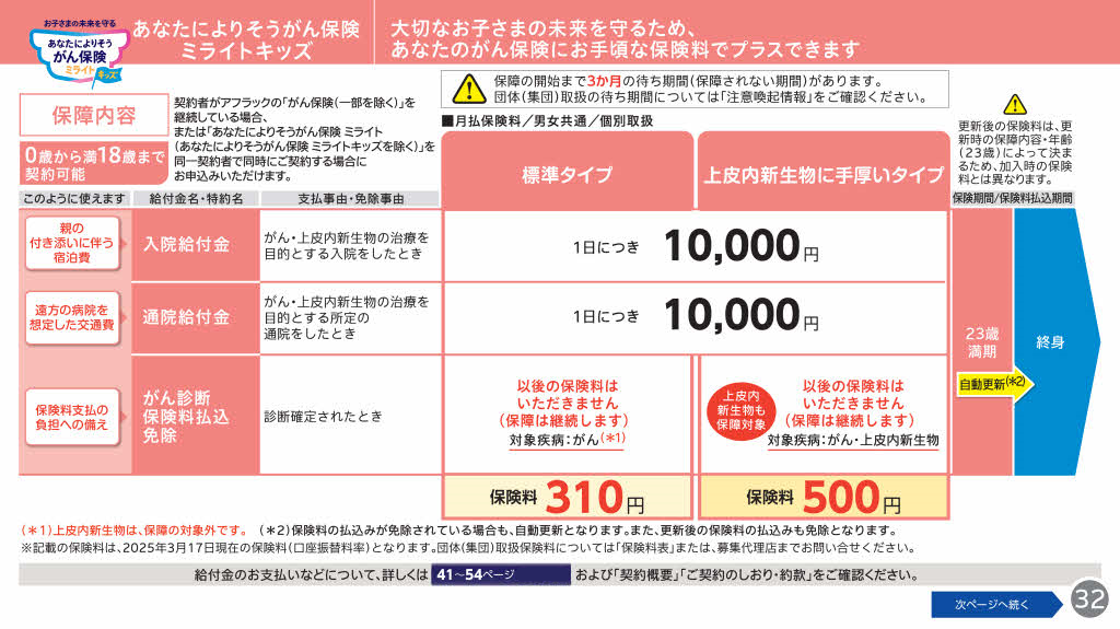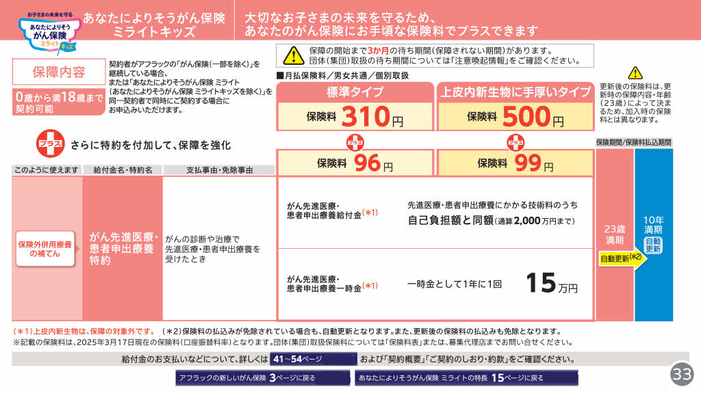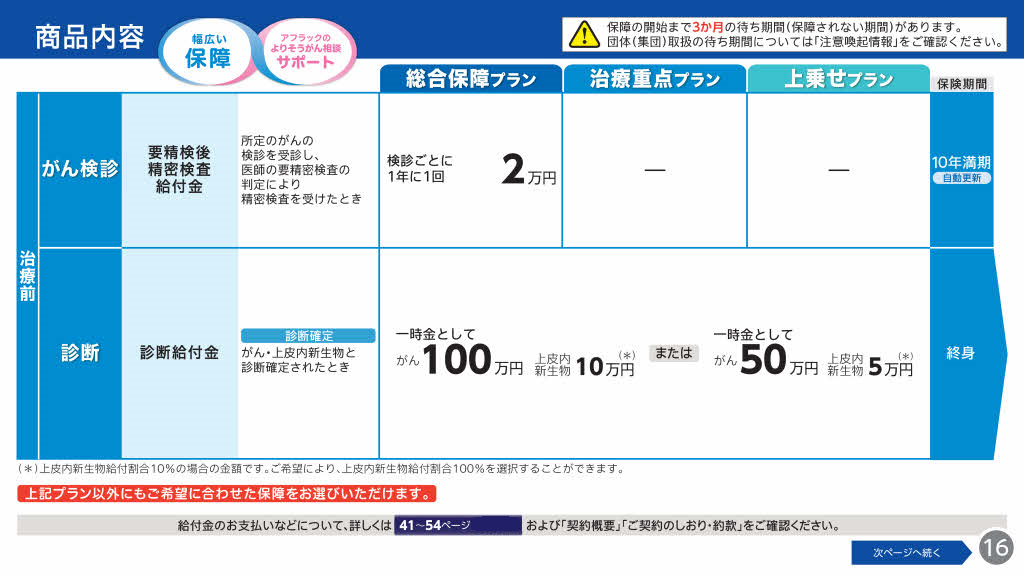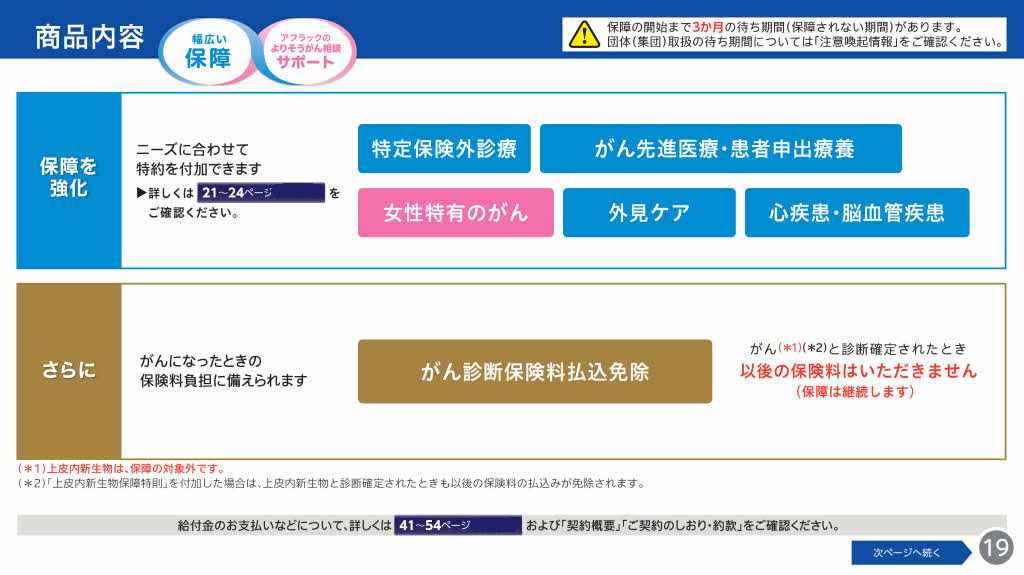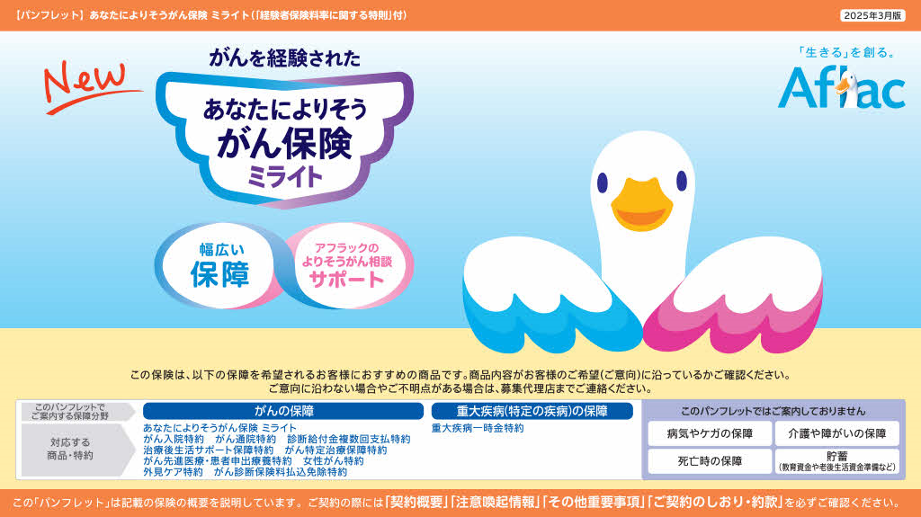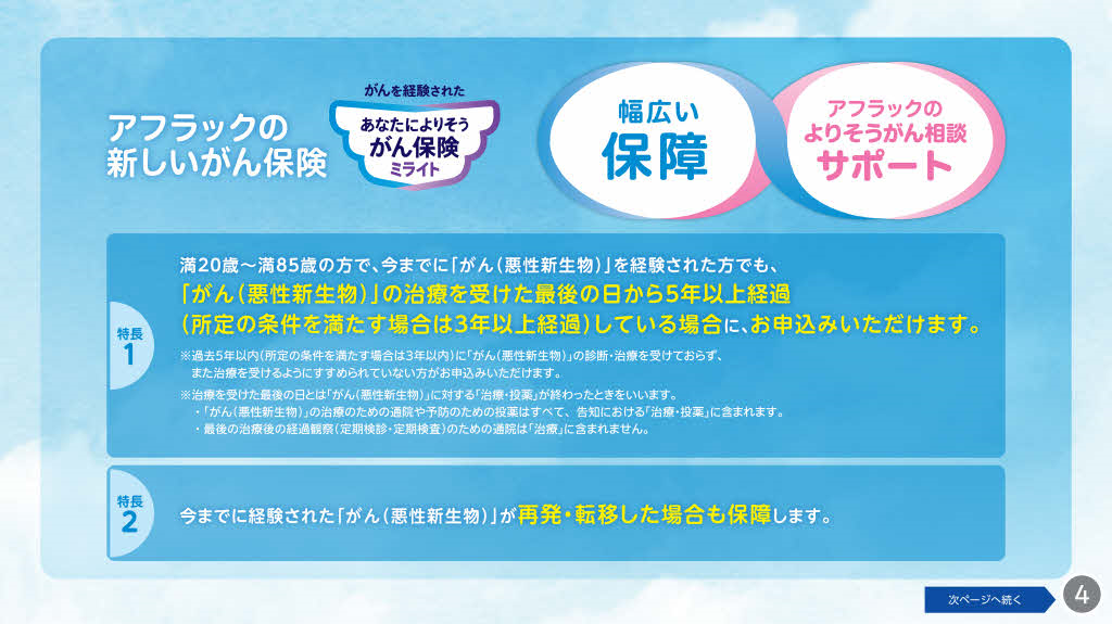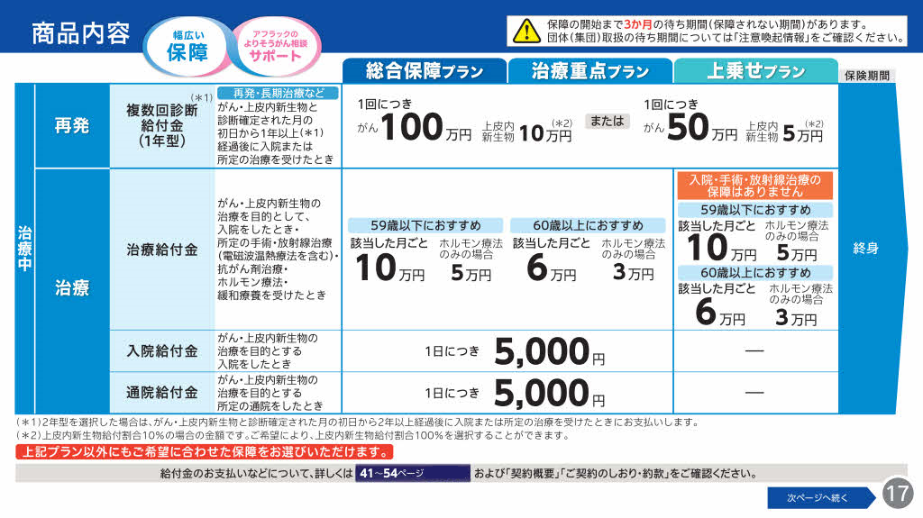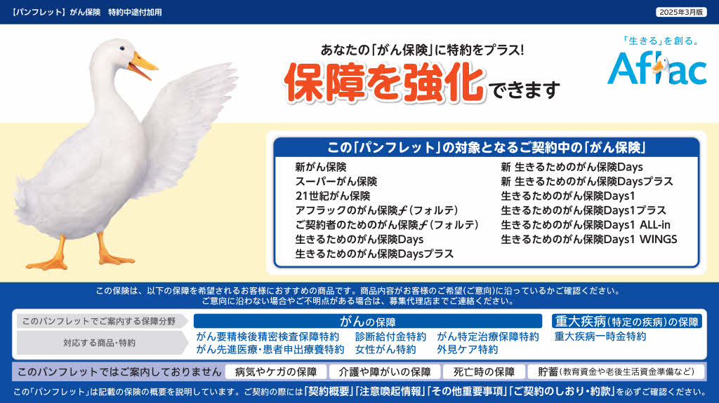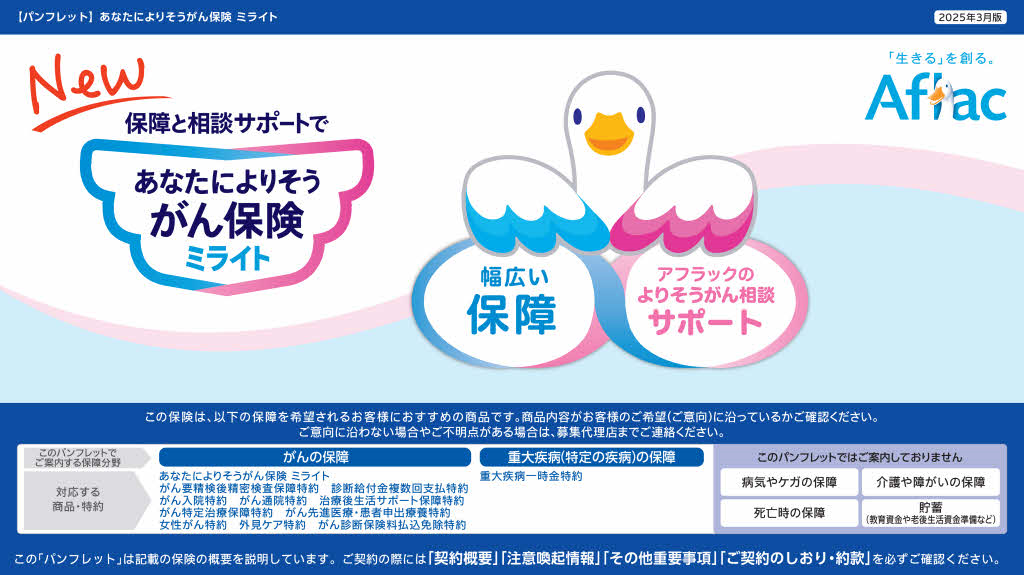 ※【がん保険ミライト 特約中途付加】は、アフラック「がん保険」のご契約者様専用商品です。現在契約中の「がん保険〔対象証券〕」と合わせてご契約いただくことで、不足しているがんの保障を補強し、アフラックで最新の保障にすることができます。(現在契約中の「がん保険」を切替え・変更するものではなく特約でもありません)。現在ご契約中の「がん保険〔対象証券〕」は今後も大切に継続して下さい。