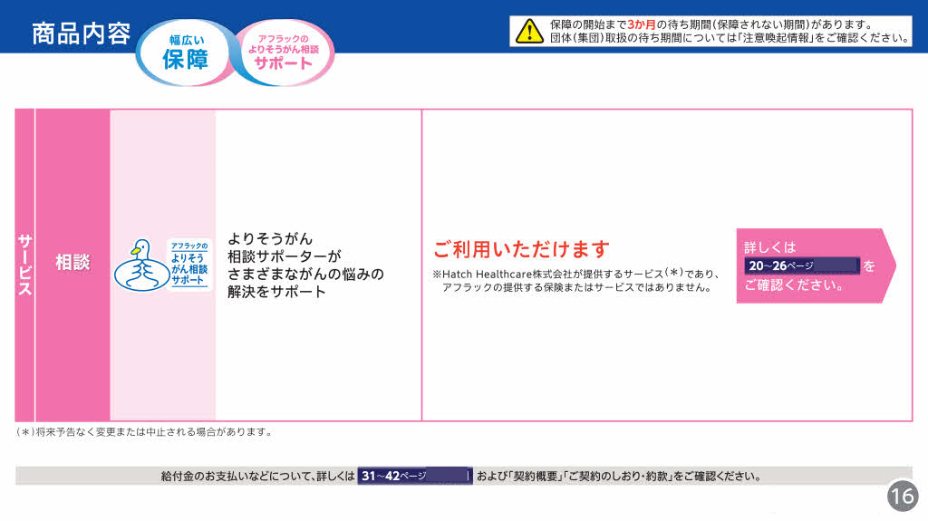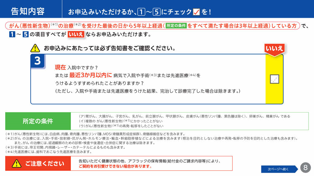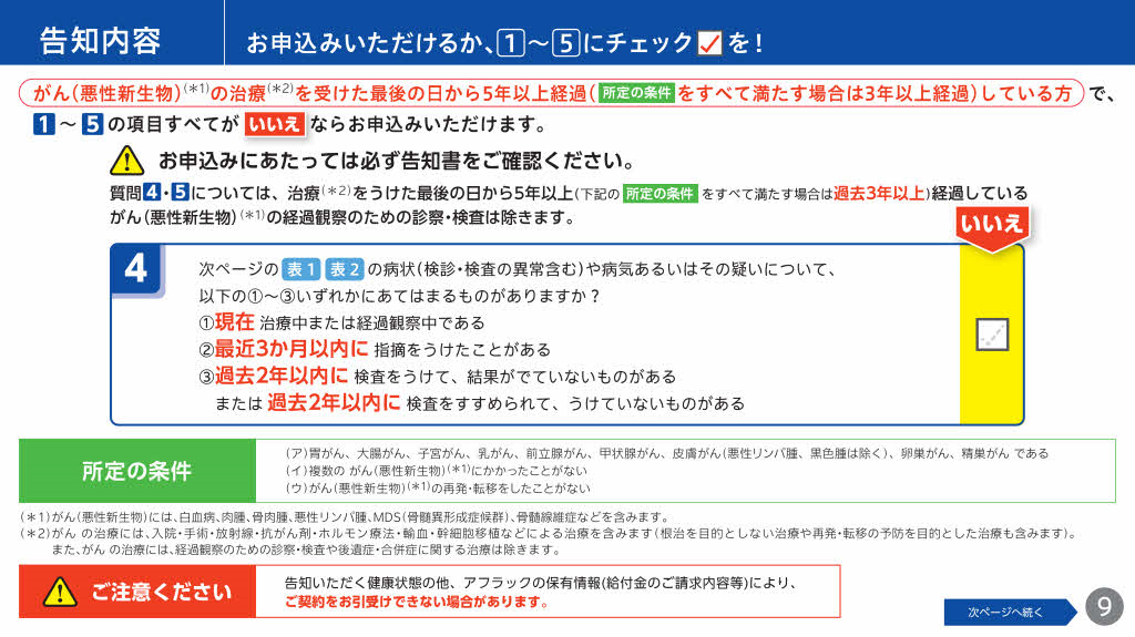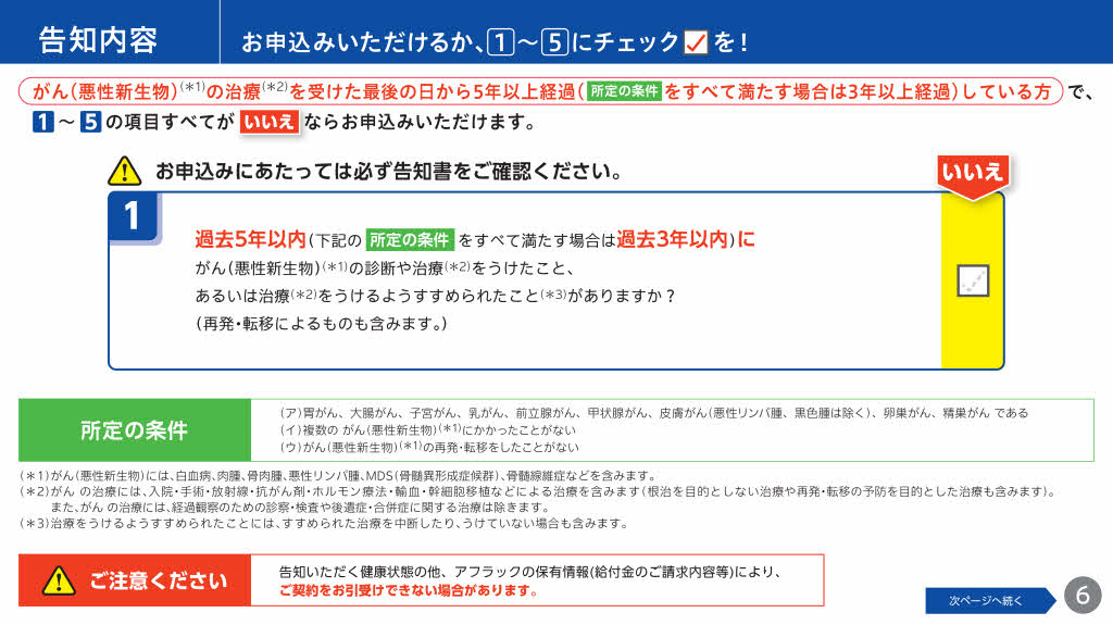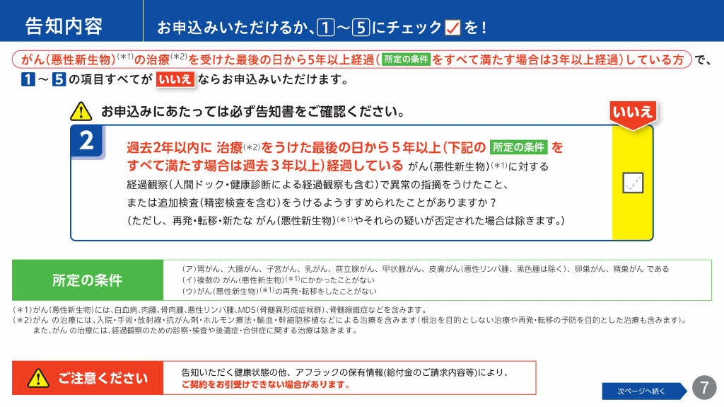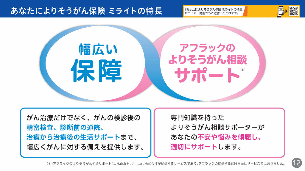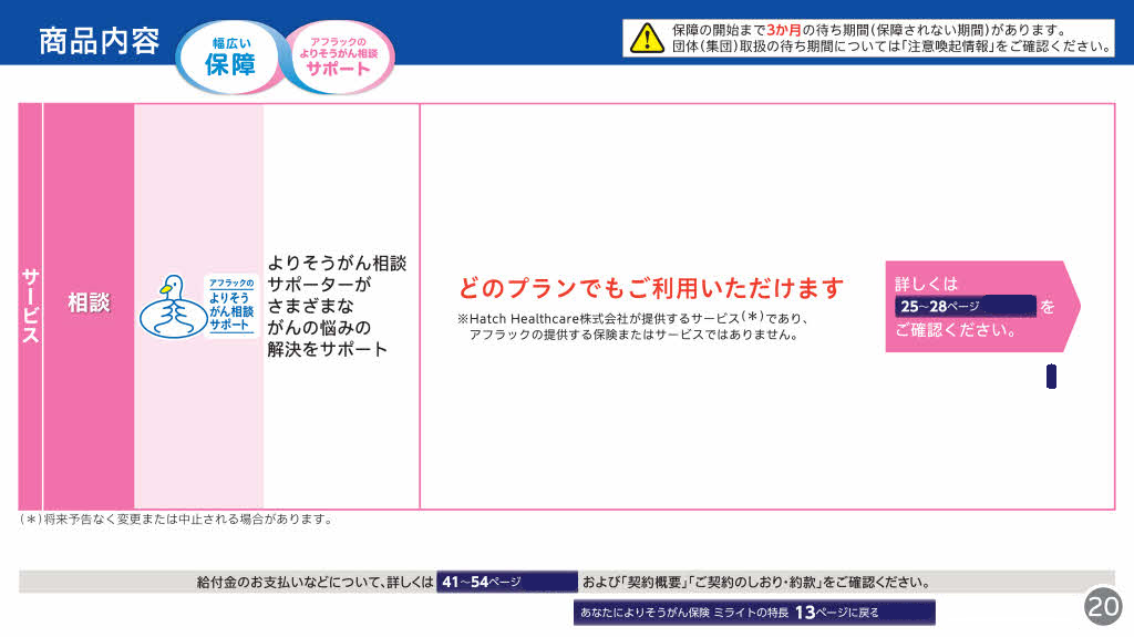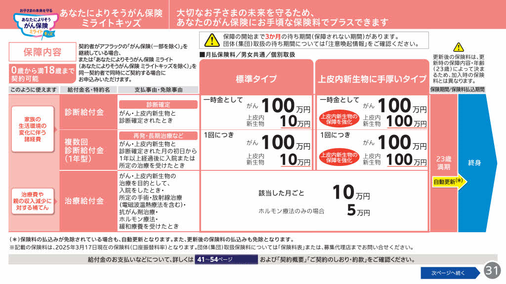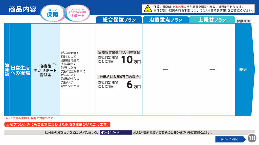 ※【がん保険ミライト 特約中途付加】は、アフラック「がん保険」のご契約者様専用商品です。現在契約中の「がん保険〔対象証券〕」と合わせてご契約いただくことで、不足しているがんの保障を補強し、アフラックで最新の保障にすることができます。(現在契約中の「がん保険」を切替え・変更するものではなく特約でもありません)。現在ご契約中の「がん保険〔対象証券〕」は今後も大切に継続して下さい。