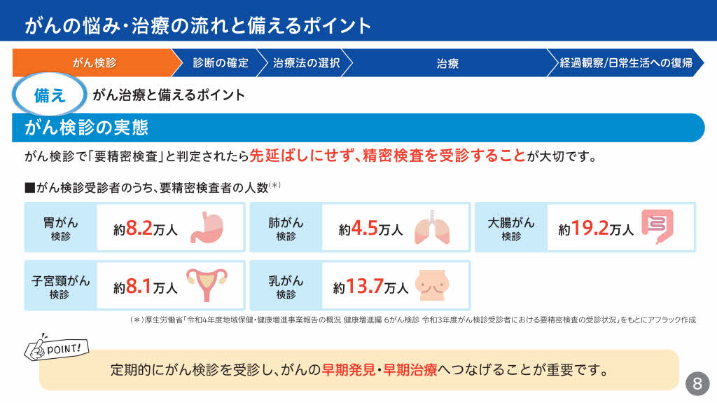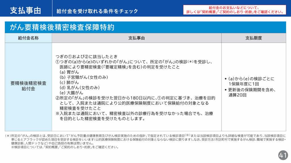 ※所定のがんの検診を受診し、医師の要精密検査の判定により精密検査を受けたとき、給付金をお受け取りいただけます。