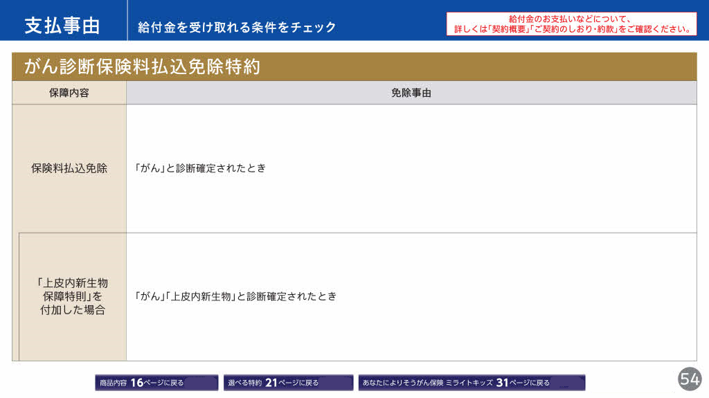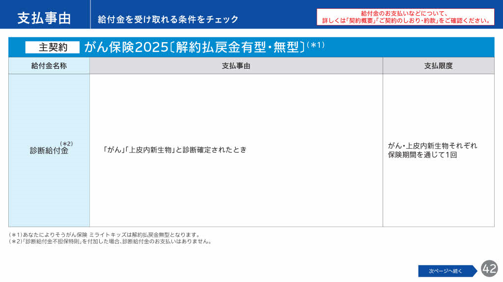 ◉「契約概要」「注意喚起情報」「その他重要事項」「ご契約のしおり・約款」は、商品内容やご契約に関する大切な事項を記載しています。“お支払いできない場合”や“新たな保険契約への乗り換えやご契約の見直し”など、お客様にとって不利益になることも記載していますので、必ずご確認ください。