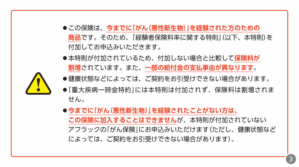 ※この保険は、今までに「がん(悪性新生物)」を経験された方のための商品です。そのため、「経験者保険料率に関する特則」を付加してお申込みいただきます。経験者保険料率に関する特則が付加されている為、付加しない場合と比較して保険料が割増されています。また、一部の給付金の支払い事由や付加できる特約が異なります。健康状態などによっては、ご契約をお引き受け出来ない場合があります。
