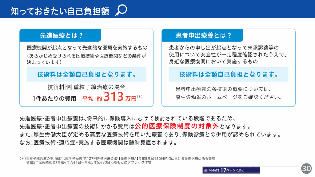 ◉「先進医療」および「患者申出療養」は、厚生労働大臣が認める医療技術です。これらは、医療技術ごとに適応症(対象となる疾患・病状など)および実施する医療機関が限定されています。また、医療技術・適応症・実施する医療機関は随時見直されます。